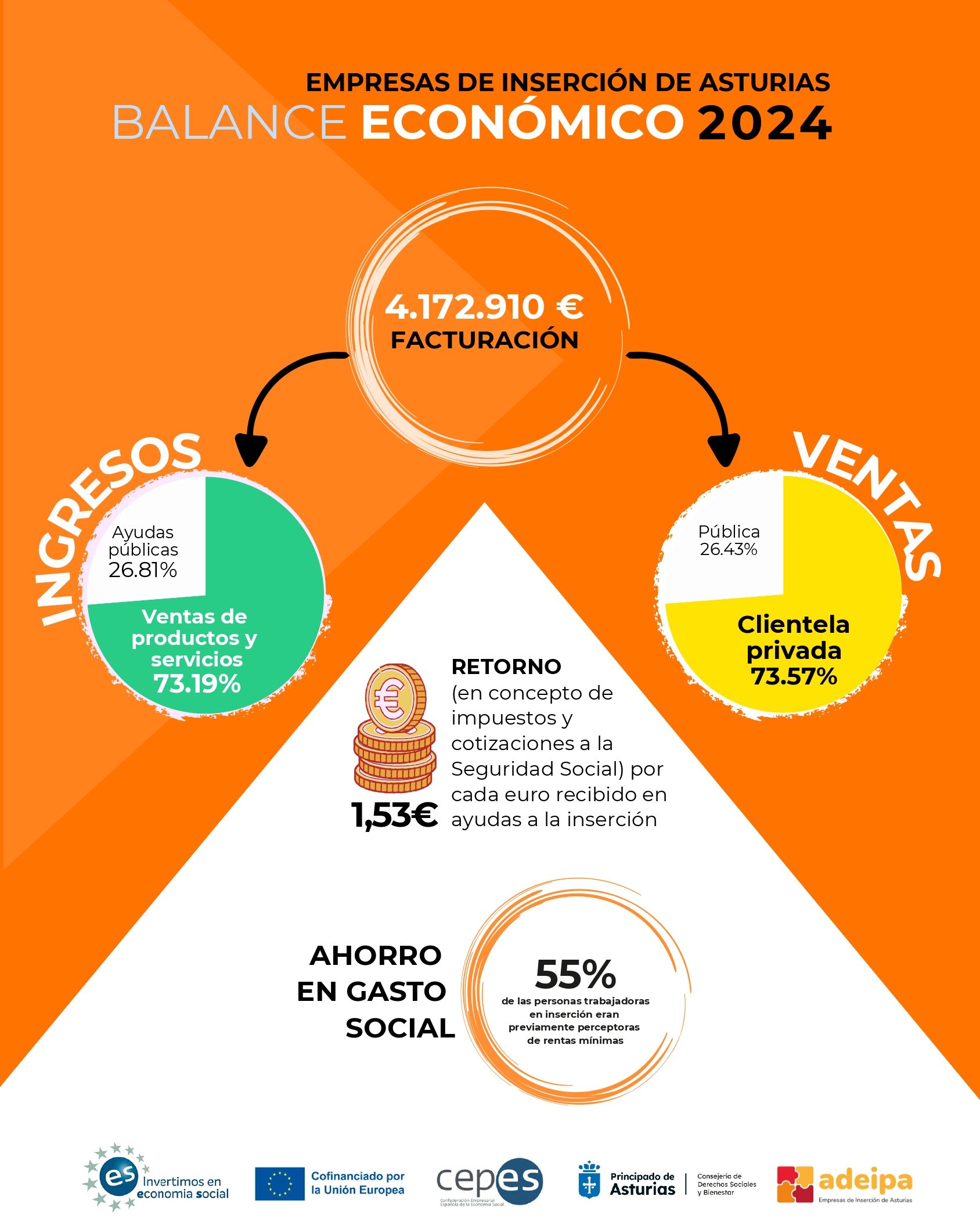 En el año 2024 la facturación de las empresas de inserción asturianas superó los 4 millones de euros. Cabe destacar que el 73% de los ingresos de las empresas de inserción asturianas vino de la venta de productos y servicios, y que el 75% de su clientela es privada.